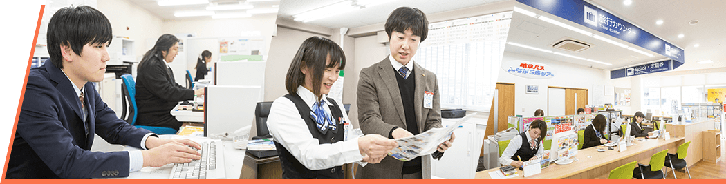 | ー バス営業部 | バスダイヤの作成、バス停の新設・移設、交通規制対応、イベント時のシャトルバス計画などバス運行の統括業務を行います。シャトルバス運行時には、最前線でお客様へのご案内業務を行うなど、デスクワークだけでなくアクティブな仕事も担います。 |
