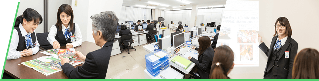 | ー 営業管理部 | 運行に関する事業計画を立案し、行政に対して路線や補助金の申請を行います。さらに運行に関わるシステムや車両の導入・管理などバス運行に欠かせない仕事をしています。また、地域の方にバスに親しみを持ってもらう活動として、特別乗車券の企画やイベントへの参加を積極的に行っています。 |