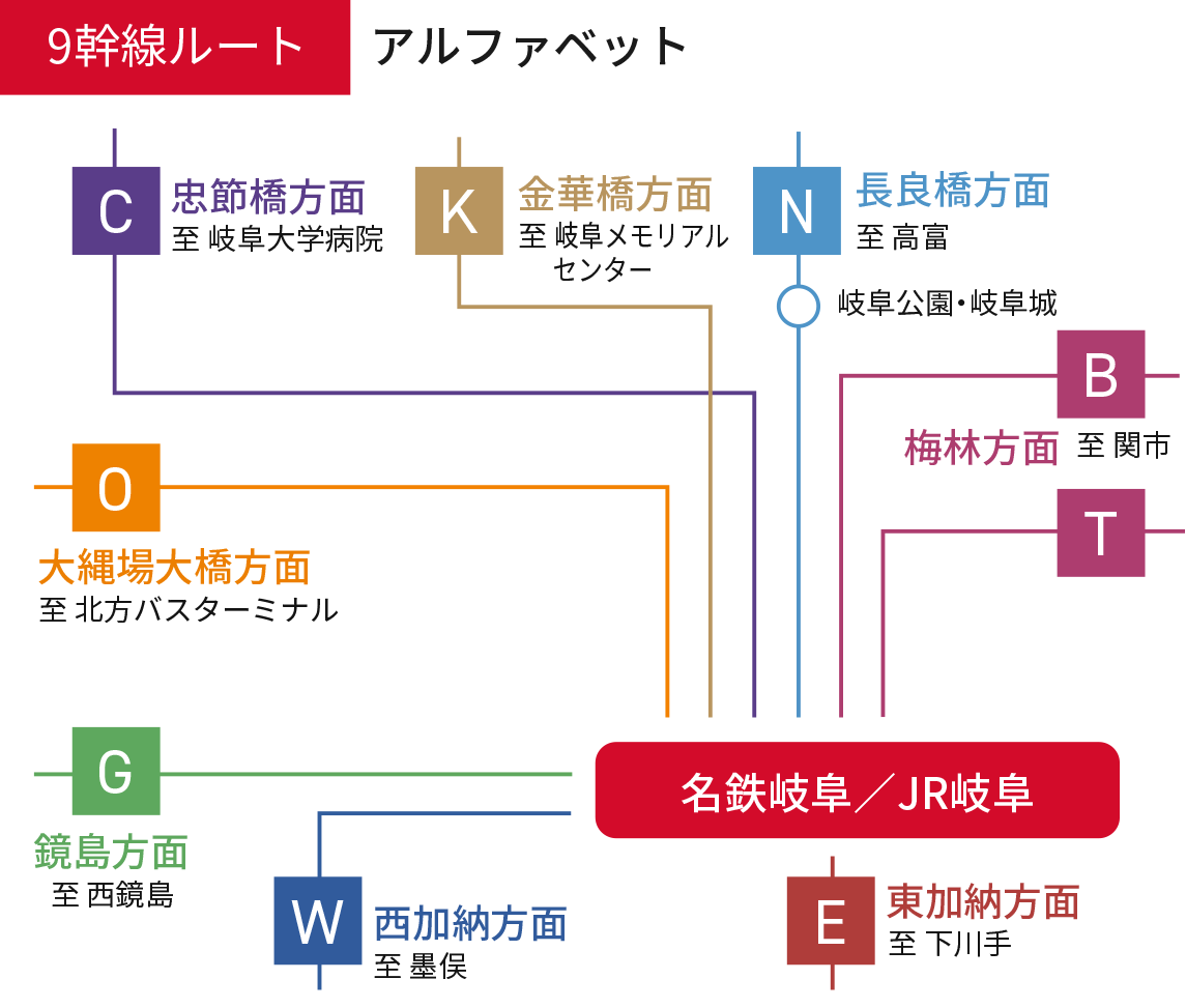 当社路線を岐阜駅を中心とした9つの幹線に分け、
