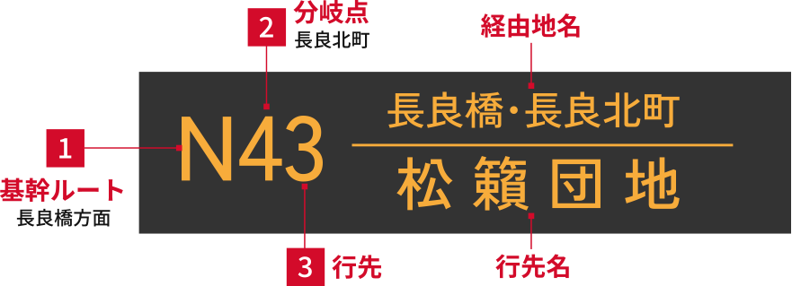 バス停に到着しましたら、掲出の時刻表に乗車予定のバスの「行き先」と「発車予定時刻」が記載されていることをご確認ください。