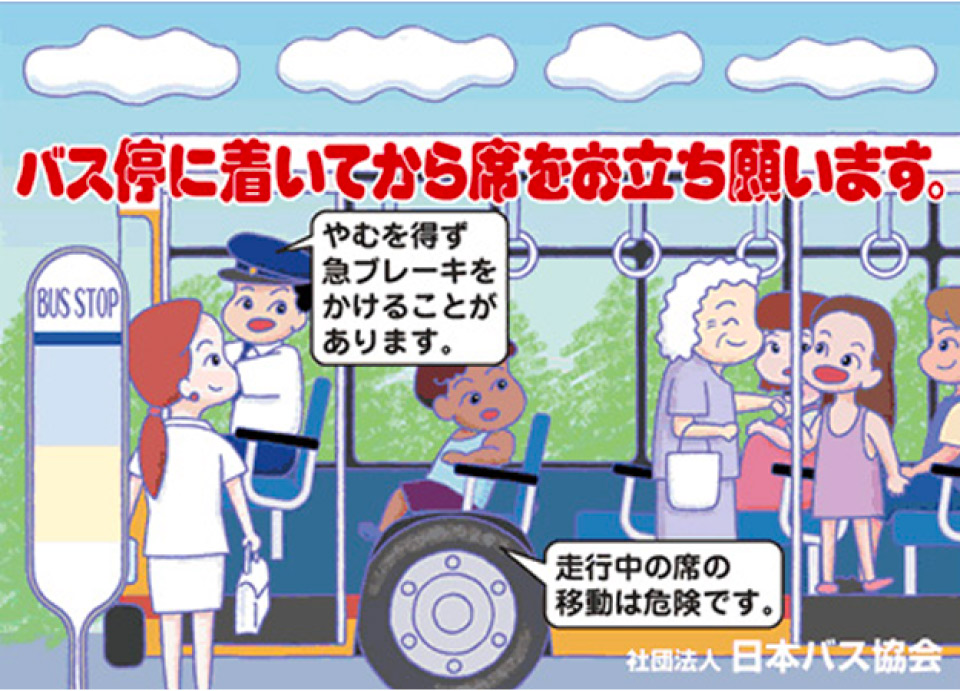 走行中に席を離れると、転倒などにより思わぬけがをする場合があります。お降りの際は、バスが完全に停車し、扉が開いてから席をお立ち願います。